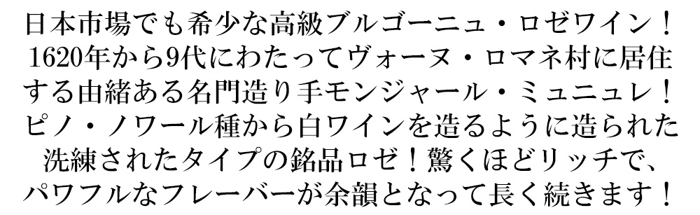 このブルゴーニュ・ロゼは驚くほどリッチでパワフルなフレーバーが余韻となって長く続きます!日本市場でも希少なモンジャール・ミュニュレのブルゴーニュ・ピノ・ノワール・ロゼがグレイトヴィンテージ[2023]年で限定で少量入荷!少量入荷につきブル・ピノファンの方はお急ぎください!