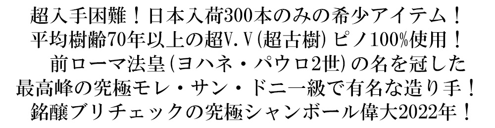 シャンボール・ミュジニーとジュヴレ・シャンベルタン村の間にあり、5つのグラン・クリュを持つ小さな村、モレ・サン・ドニ!前ローマ法王ヨハネ・パウロ2世に献上した唯一のワイン!しかも前ローマ法王の名を冠した究極モレ・サン・ドニ・一級!“キュヴェ・デ・パプ・シャンボール2世”で有名なドメーヌ・クリストフ・ブリチェック!による「口当たりは、レースのように繊細で、コート・ド・ニュイで最も女性的な味わい!タンニンはキメ細かく、アロマは火を通したフランボワーズやイチゴなどの赤い果実!熟成とともにスミレやプルーンなどの柔らかいブーケが出る」と言われる、高級シャンボール・ミュジニー!