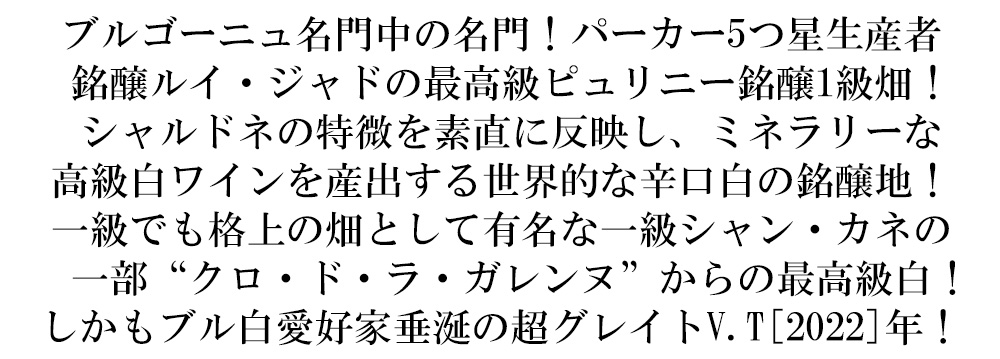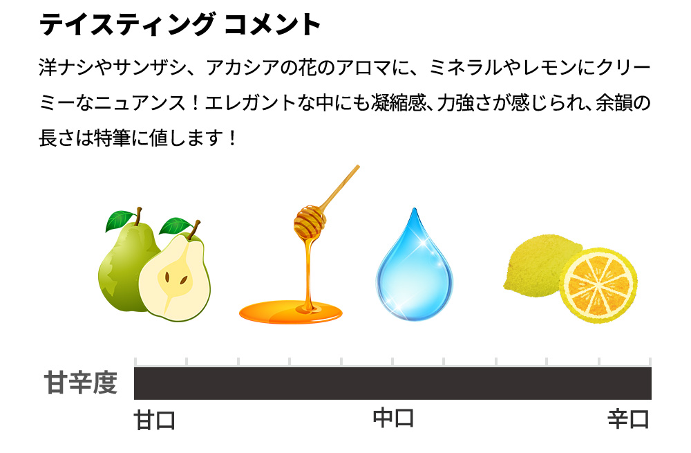 洋ナシやサンザシ、アカシアの花のアロマに、ミネラルやレモンにクリーミーなニュアンス!エレガントな中にも凝縮感、力強さが感じられ、余韻の長さは特筆に値します!しかも蔵出しの大人気スーパーグレイトヴィンテージ[2022]年もの!しかも正規代理店輸入品で極少量入荷!