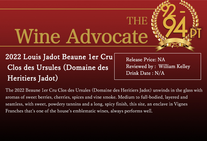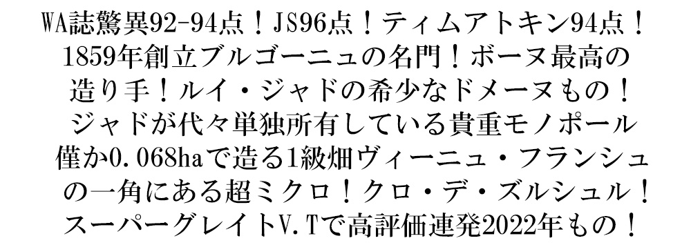 この[2022]年のクロ・デ・ズルシュールで各誌指折り!ジェームス・サックリング驚異の96点でコメントは「フルボディの華やかな赤と黒の果実味に、きめ細かいタンニンが絡みつく、大きくまろやかで寛大なワイン。クロ・デ・ウルスはジャドのモノプルであり、彼らが代々使用してきた畑のひとつである。スパイシーなシナモン、クローブ、トーストで始まり、口に含むと鮮やかなラズベリー、レッドプラム、ミントが広がる。」!