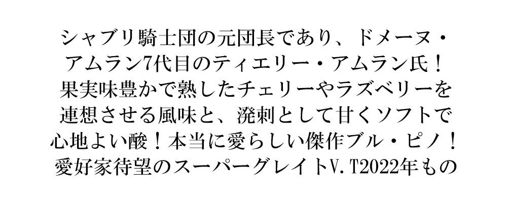名門ドメーヌ・アムランの極旨ブル・ピノが大人気スーパーグレイトヴィンテージ[2022]年でしかもこのブルゴーニュワイン全体の価格高騰時良心価格でしかも蔵出し品で極少量入荷!