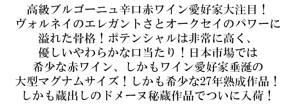 ヴォルネイのエレガントさとオークセイのパワーに溢れた骨格!ポテンシャルは非常に高く、優しいやわらかな口当たり!ソフトでまろやかなタンニンは、熟したフルーツのデリケートでありながら豊かな味わい!
