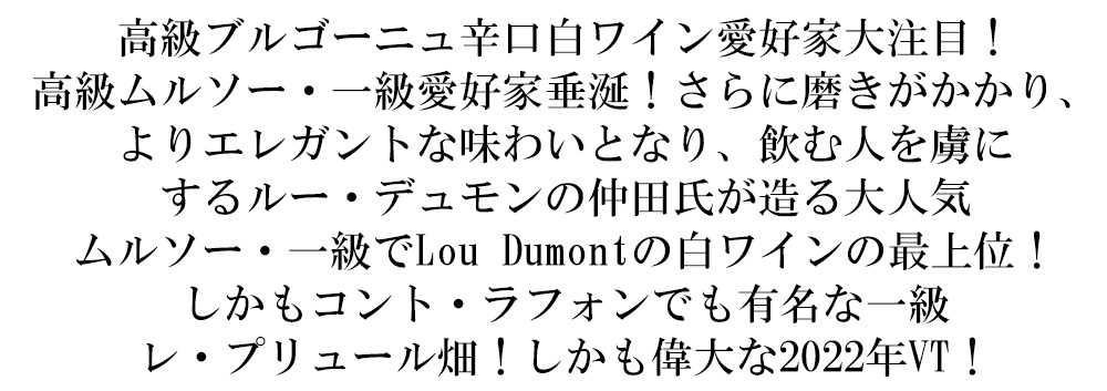 ずばり!白ワイン大好きのルー・デュモン仲田氏の入魂の逸品が歴史的スーパーグレイトヴィンテージ[2022]年もので!しかも数ヶ月前のルー・デュモンのセラー出しで限定少量入荷!特に、ルー・デュモンの白ワインは、入荷即完売!の状態が続いています!しかも今回は人気のSPグレイトヴィンテージです!お早めに!