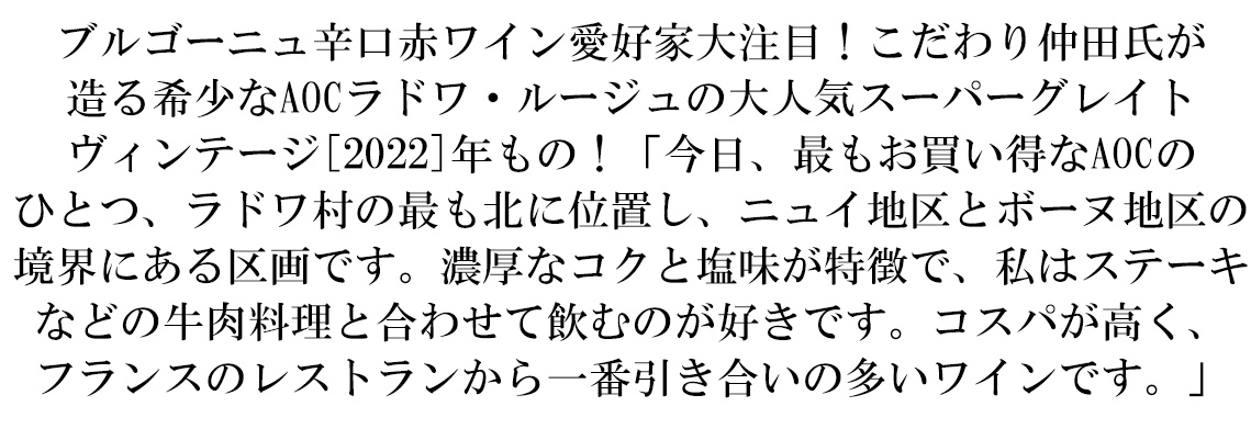 こだわり仲田氏が造る希少なAOCラドワ・ルージュの大人気スーパーグレイトヴィンテージ[2022]年もの!