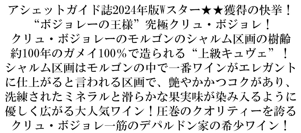 入手困難!ブルゴーニュ辛口フルボディ赤ワイン愛好家大注目!クリュ・ボジョレーのモルゴンのシャルム区画の樹齢約100年のガメイ100%で造られる“上級キュヴェ”!