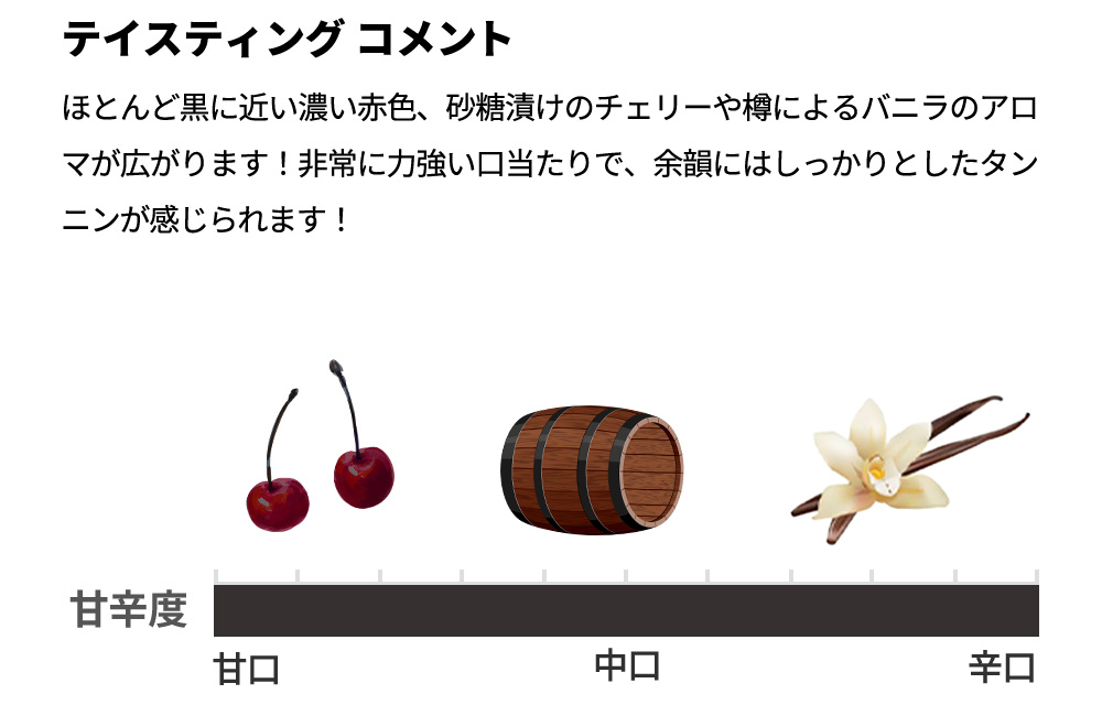 ほとんど黒に近い濃い赤色、砂糖漬けのチェリーや樽によるバニラのアロマが広がります!非常に力強い口当たりで、余韻にはしっかりとしたタンニンが感じられます!