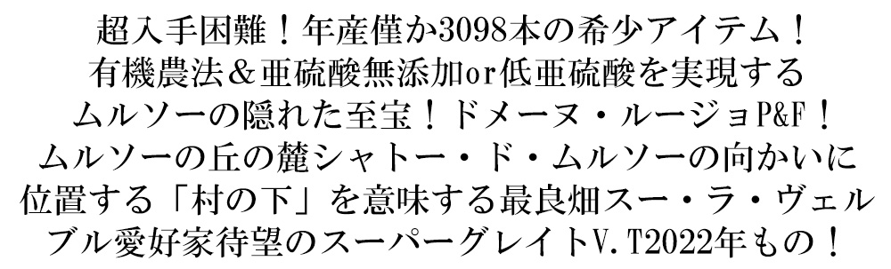 年産僅か3098本のみの希少アイテム!有機農法&亜硫酸無添加or低亜硫酸を実現するムルソーの隠れた至宝!今後、入手困難が予想される銘醸ドメーヌ・ルージョ!