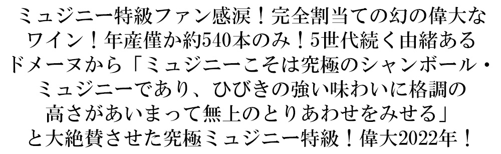 ドメーヌからの美食のハーモニーは半熟フォアグラのテリーヌ、イチジクのロースト添え、森のキノコ入りスクランブルエッグ、トラウト・ア・ラ・トラウト、鴨のエギュイエット、オレンジソース!贅沢な質感!香りの偉大な複雑さ!気品のあるタンニン!究極ミュジニー・グラン・クリュ・特級が、素晴らしい品質となったスーパーグレイトヴィンテージ2022年で限定極少量入荷!!