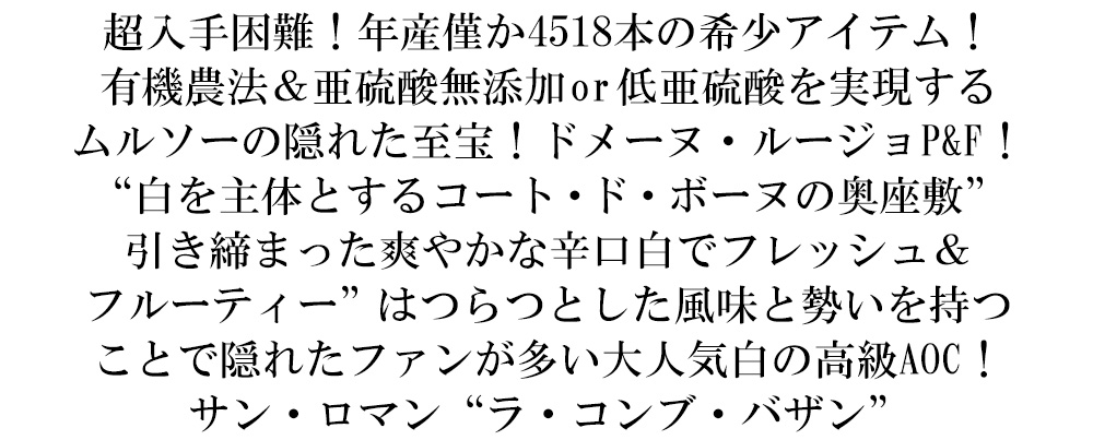 柑橘や花のアロマが特徴で、豊かなミネラルを伴うエネルギッシュな味わい!クリーミーな余韻が長く続く辛口白ワイン!究極サン・ロマン“ラ・コンブ・バザン”がスーパーグレイトヴィンテージ[2022]年で蔵出しで限定で少量入荷!
