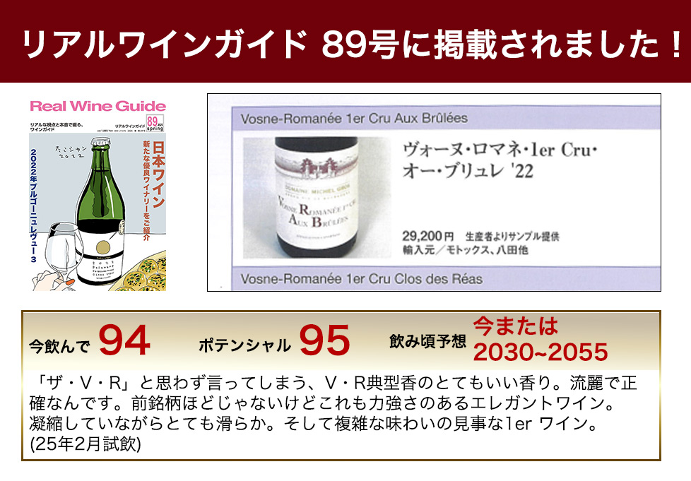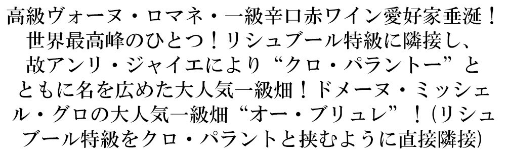 造り手はグロ・ファミリーの一員!ジャン・グロの次男であるベルナール・グロのドメーヌ!ミッシェル・グロ!非常に水はけの良い畑でブドウがよく熟し、非常に濃厚で芳醇なプルミエ・クリュとして人気の一級から少量生産の大人気のオー・ブリュレ!