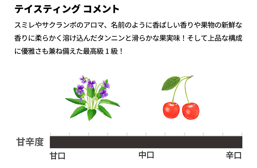 スミレやサクランボのアロマ、名前のように香ばしい香りや果物の新鮮な香りに柔らかく溶け込んだタンニンと滑らかな果実味!そして上品な構成に優雅さも兼ね備えた最高級1級!ブルゴーニュ赤ワイン愛好家垂涎の逸品!