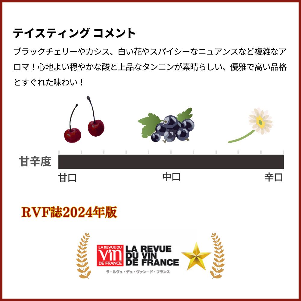 ブラックチェリーやカシス、白い花やスパイシーなニュアンスなど複雑なアロマ!心地よい穏やかな酸と上品なタンニンが素晴らしい、優雅で高い品格とすぐれた味わい!