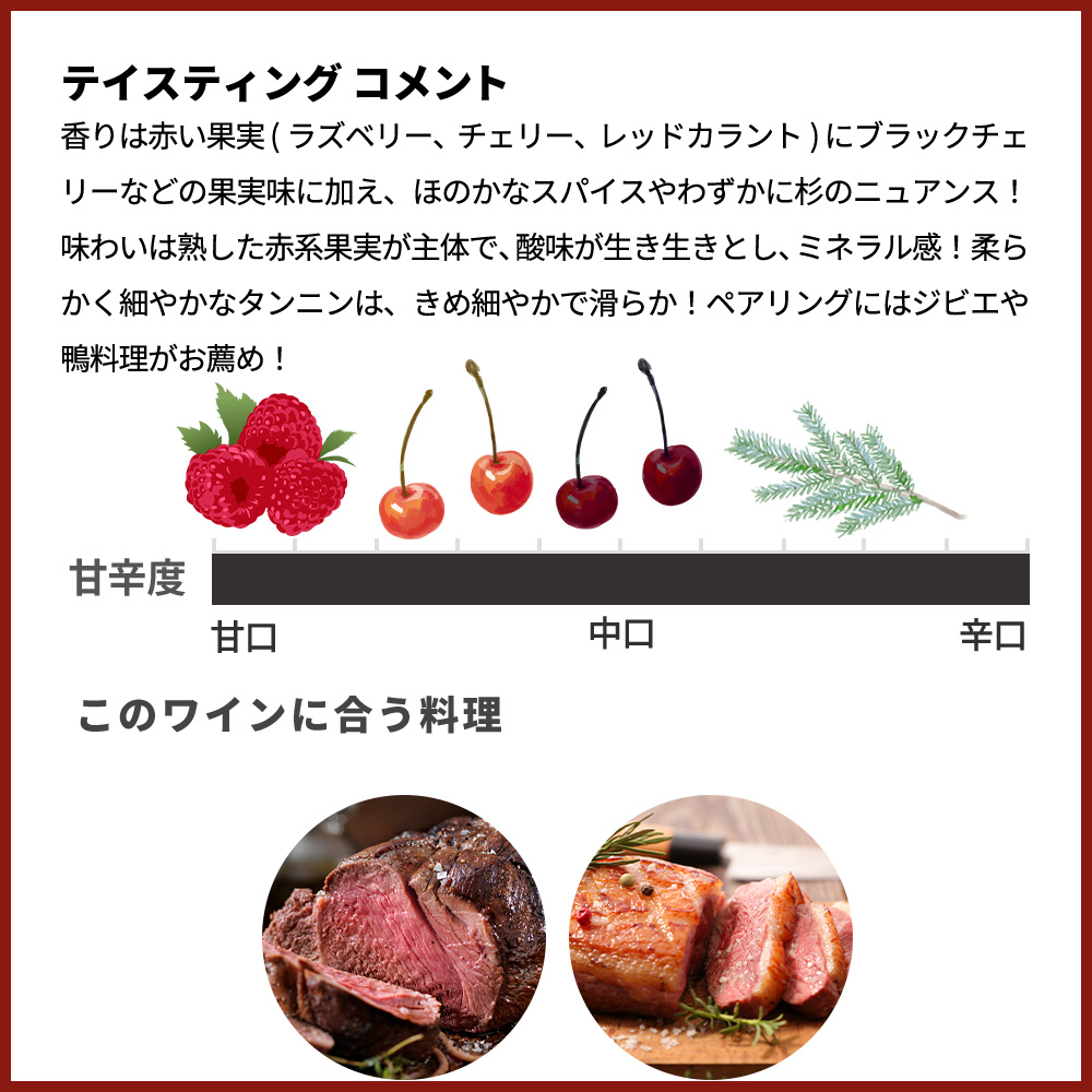 香りは赤い果実 (ラズベリー、チェリー、レッドカラント) にブラックチェリーなどの果実味に加え、ほのかなスパイスやわずかに杉のニュアンス!味わいは熟した赤系果実が主体で、酸味が生き生きとし、ミネラル感!柔らかく細やかなタンニンは、きめ細やかで滑らか!しなやかで優しく、溶け込むような旨味があり、バランスがいい!フレッシュで調和が取れた酸味、余韻は口中に長く続く果実味とバランスの取れた酸味が特徴!熟成によりさらに滑らかになる可能性や将来性を感じる!ペアリングにはジビエや鴨料理がお薦め!