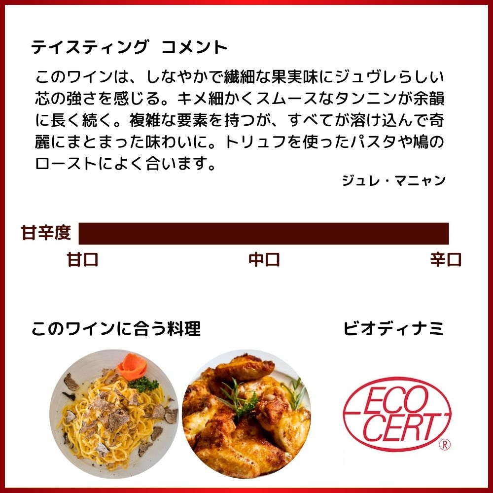 ジュレ・マニャンのテイスティングコメントと料理との相性は『このワインは、しなやかで繊細な果実味にジュヴレらしい芯の強さを感じる。キメ細かくスムースなタンニンが余韻に長く続く。複雑な要素を持つが、すべてが溶け込んで奇麗にまとまった味わいに。トリュフを使ったパスタや鳩のローストによく合います。』とコメント!