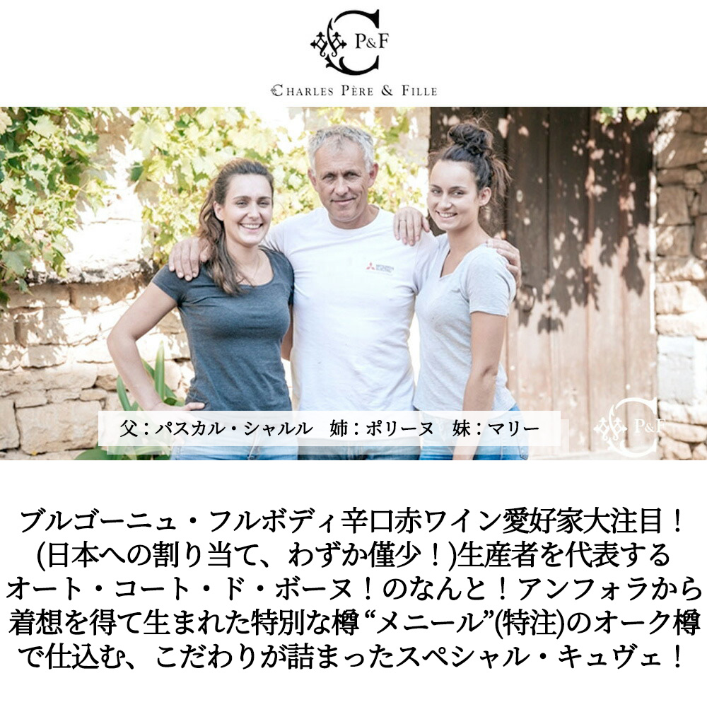 現在はフランソワ・シャルルから息子のパスカルと彼の娘ポリーヌがドメーヌを引き継ぎワイン造りを行っています!(料理と共に楽しみたいブルゴーニュ ワインのポリシーを持つ、ポリーヌは自分たちのワインを親しみやすい雰囲気の中で味わってもらいたいと考え、「La table de Pauline(ポリーヌの食卓)」というレストランを開いています。)まさに手造り100%!