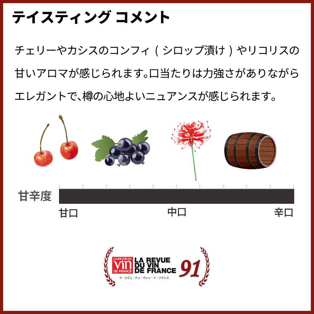 彼女からのコメントは『特別な樽“メニール”で熟成させたキュヴェです。紫を帯びた赤色。チェリーやカシスのコンフィ(シロップ漬け)やリコリスの甘いアロマが感じられます。口当たりは力強さがありながらエレガントで、樽の心地よいニュアンスが感じられます。仔羊や鴨の胸肉などの肉類との相性は抜群です。』インポーターさんの稲葉さんが最大の発見と言うドメーヌからの生産者を代表するオート・コート・ド・ボーヌ。特注のオーク樽で仕込む、こだわりが詰まったキュヴェ!