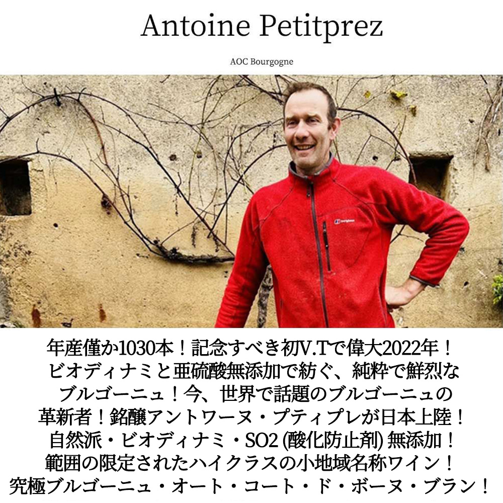今、世界で話題のブルゴーニュの革新者アントワーヌ・プティプレの超こだわり究極ブルゴーニュ・オート・コート・ド・ボーヌ・ブランが記念すべき初ヴィンテージでスーパーグレイトヴィンテージ[2022]年で限定で少量入荷!