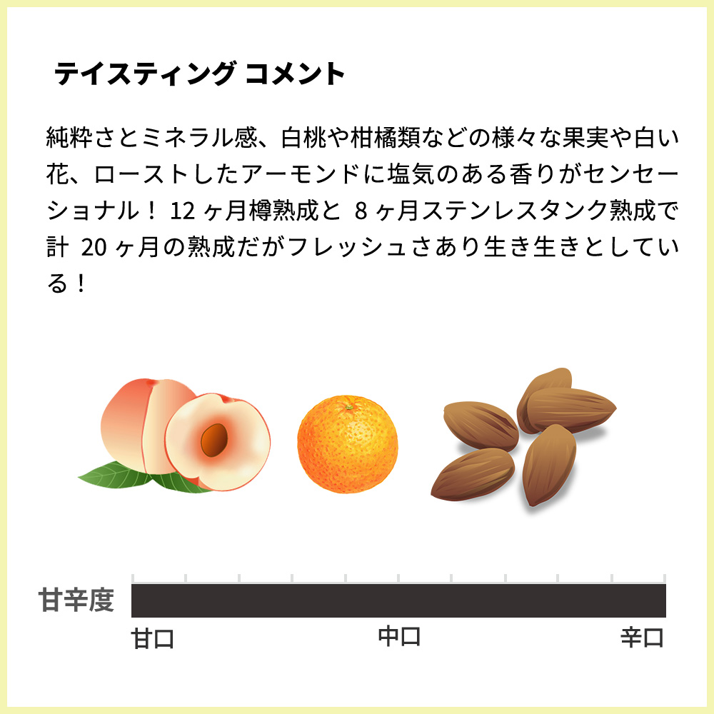 セレクション・マサールは若くてもとても複雑な実を付ける!馬耕作!純粋さとミネラル感、白桃や柑橘類などの様々な果実や白い花、ローストしたアーモンドに塩気のある香りがセンセーショナル!12ヶ月樽熟成と8ヶ月ステンレスタンク熟成で計20ヶ月の熟成だがフレッシュさあり生き生きとしている!
