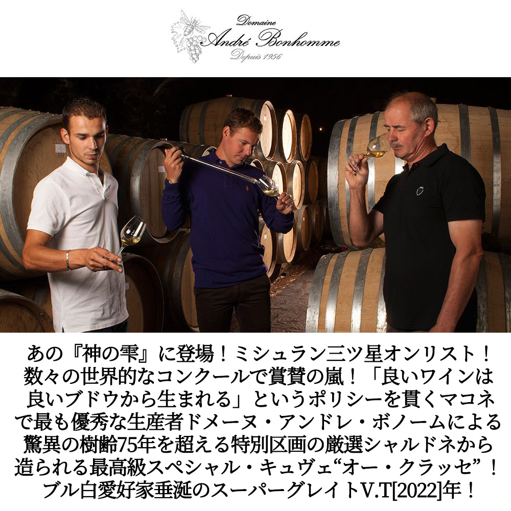 銘醸アンドレ・ボノームが誇る最高級キュヴェ!樹齢75~95年以上の超ヴィエイユ・ヴィーニュの厳選シャルドネ100%をフレンチオーク樽18ヶ月熟成で造られる圧巻の高品質辛口白ワイン!洗練されたオーク、しっかりとした果実味の濃さとミネラル感は秀逸で、完成度の高さは信じられないほど!