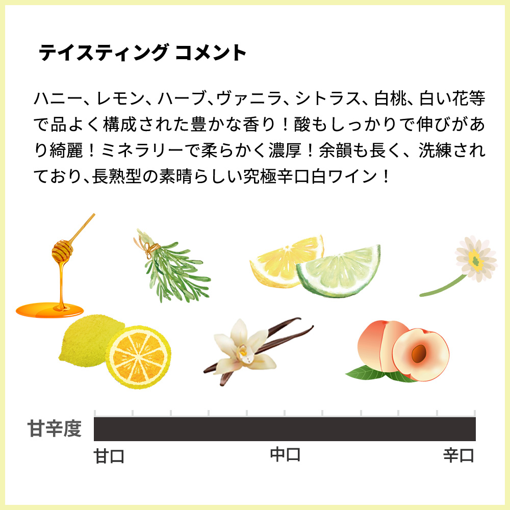 ハニー、レモン、ハーブ、ヴァニラ、シトラス、白桃、白い花等で品よく構成された豊かな香り!酸もしっかりで伸びがあり綺麗!ミネラリーで柔らかく濃厚!余韻も長く、洗練されており、長熟型の素晴らし