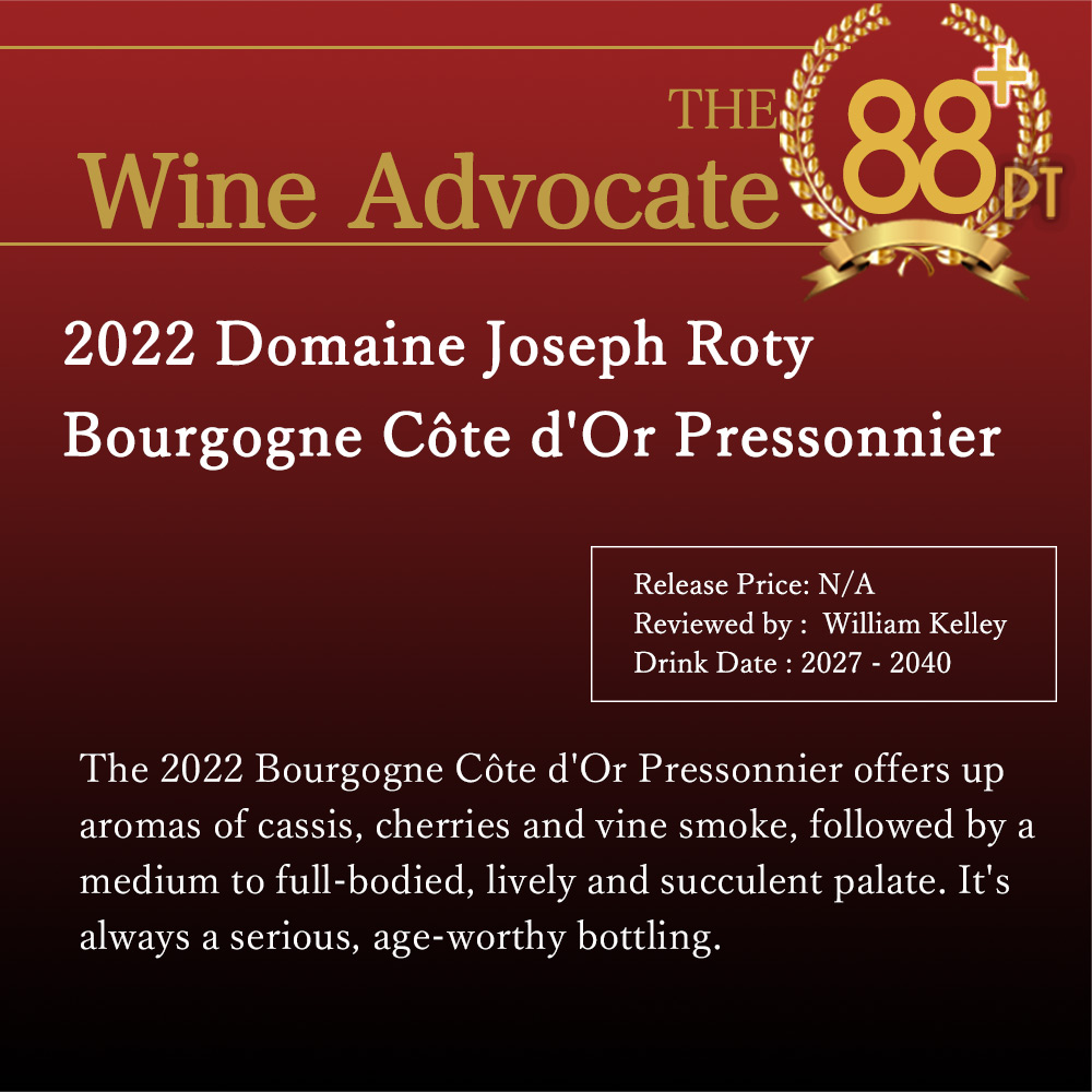 ワインアドヴォケイト誌は堂々88点で「2021年のブルゴーニュ・コート・ドール・プレソニエールは、チェリー、カシス、プラムのアロマがはじけ、クリーミーなオークの巧みなタッチに縁取られている。ミディアムからフルボディで、しなやかでサテン、生き生きとした酸と塩味のあるフィニッシュは、幅広い飲み頃を提供してくれるだろう。」と大注目!
