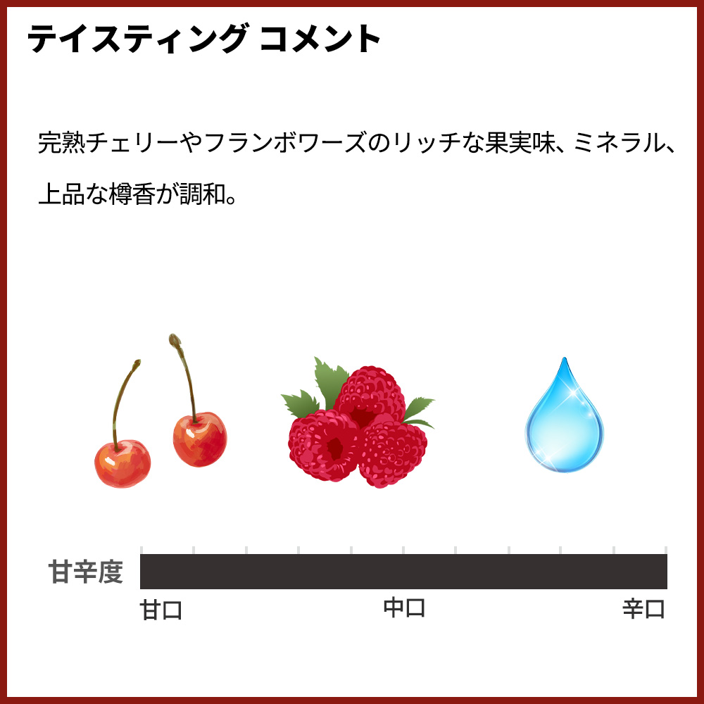赤黒系果実に土やスパイスのニュアンス。適度な骨格とまるみを兼ね備えたエレガントな赤ワインです。あまりの人気のため入手困難&超プレミア価格で取引されています。