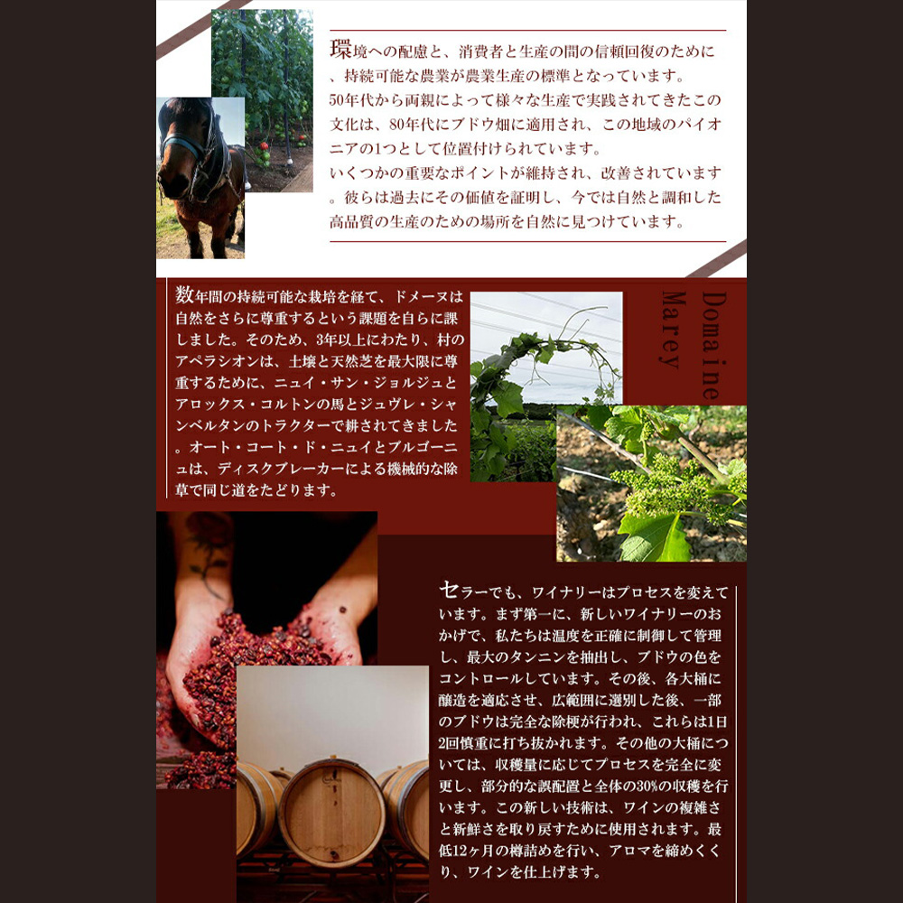 ■発酵・熟成:ステンレスタンクでアルコール発酵後、オーク樽 (新樽比率50%) でマロラクティック発酵&12ヶ月間熟成