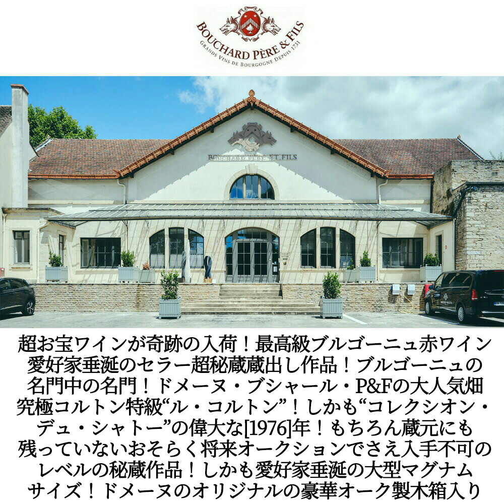 最高級ブルゴーニュ愛好家の方は入手してください!ニ度と入手不可です!愛好家の方はぜひゲットして下さい!ビロードの様な舌触りと丸みのある上品な味わい!の名門ドメーヌ・ブシャール・ペール・エ・フィスを代表する銘酒!自慢の最高級コルトン特級!しかも大型マグナムサイズがドメーヌものの蔵出し作品でロウ封印キャップ・超豪華オーク製木箱入りで限定で極少量入荷!