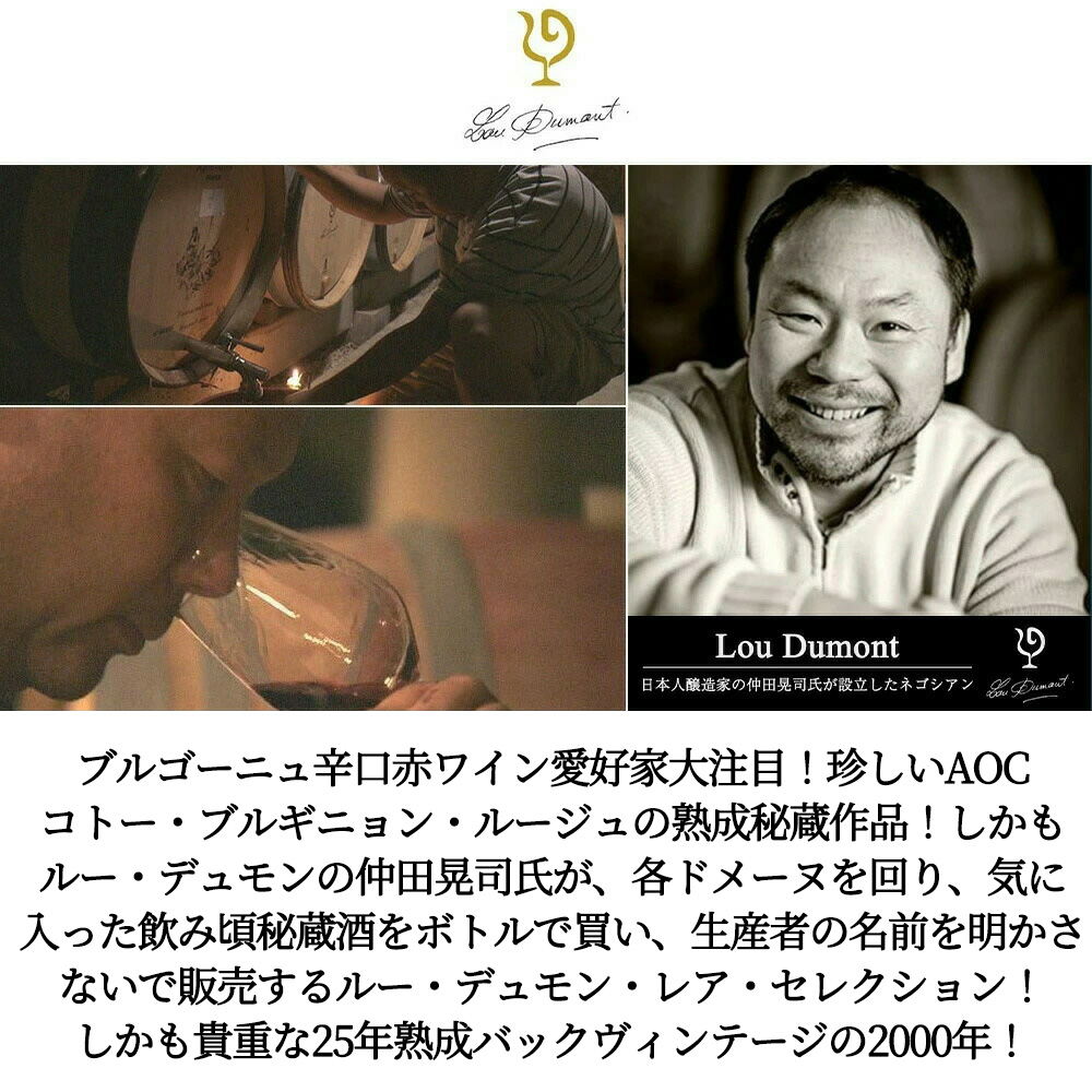 しかも造り手は、NHKの「プロフェッショナル 仕事の流儀」にも登場!フランス、アシェットガイド誌にも掲載のルー・デュモンの仲田晃司氏が、各ドメーヌを回り、気に入ったバックヴィンテージ、飲み頃秘蔵古酒をボトルで買い、生産者の名前を明かさないでルー・デュモン・レア・セレクションとして発売!