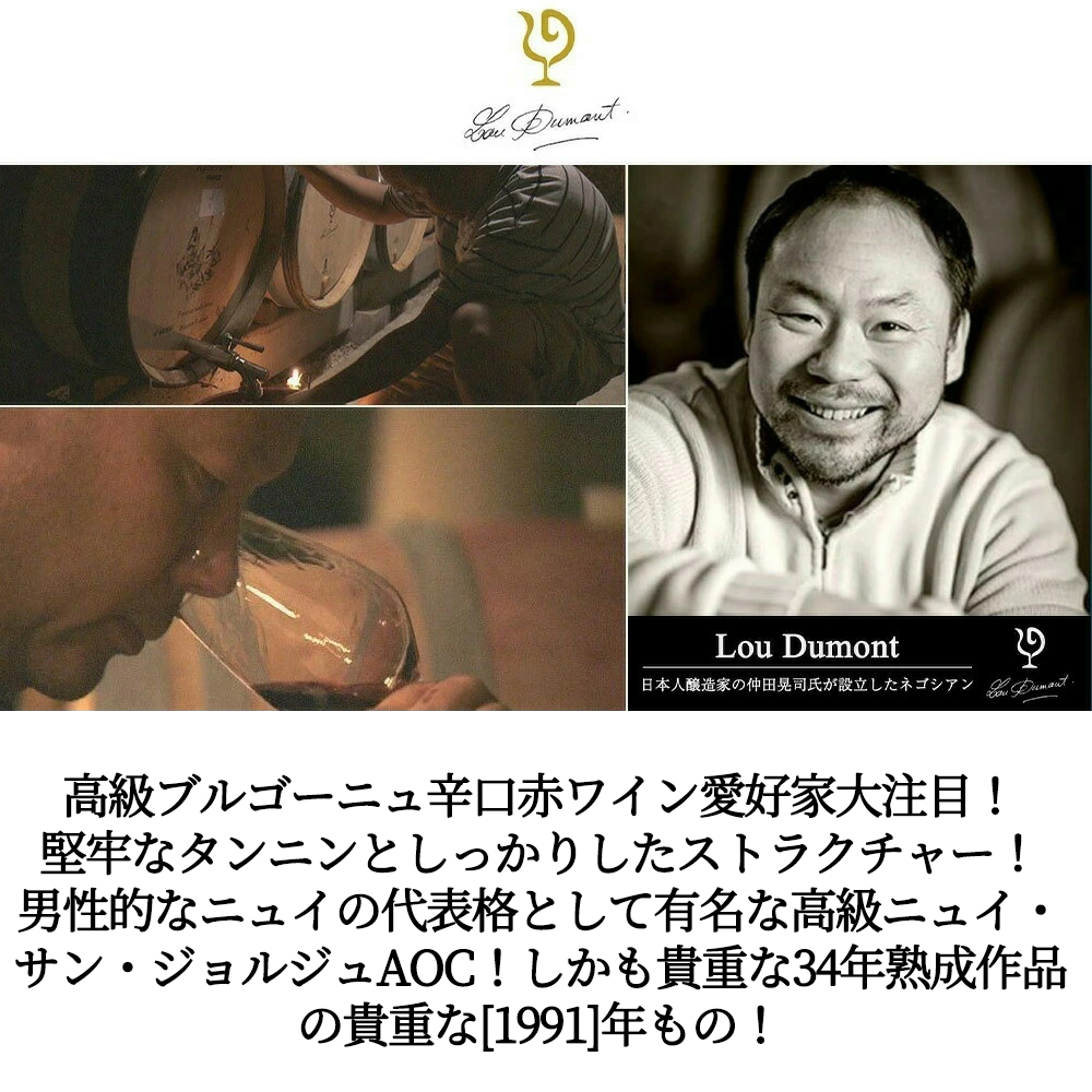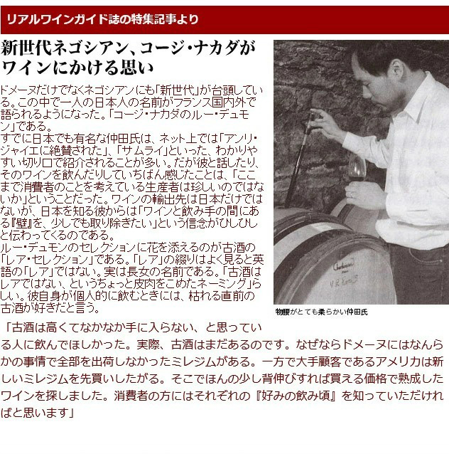日本人でありながらジュヴレ・シャンベルタン村に住み、「日本人であるということ」と「自然と人間に対する真摯な畏敬の念」を抱きながら細部にまで徹底したワイン造りに取り組むルー・デュモンの仲田氏がブルゴーニュ現地の4人の百戦錬磨のクルティエたちとタッグを組み、各ドメーヌを回り、特に気に入ったワインをボトルで買い、ルー・デュモン・レア・セレクション。