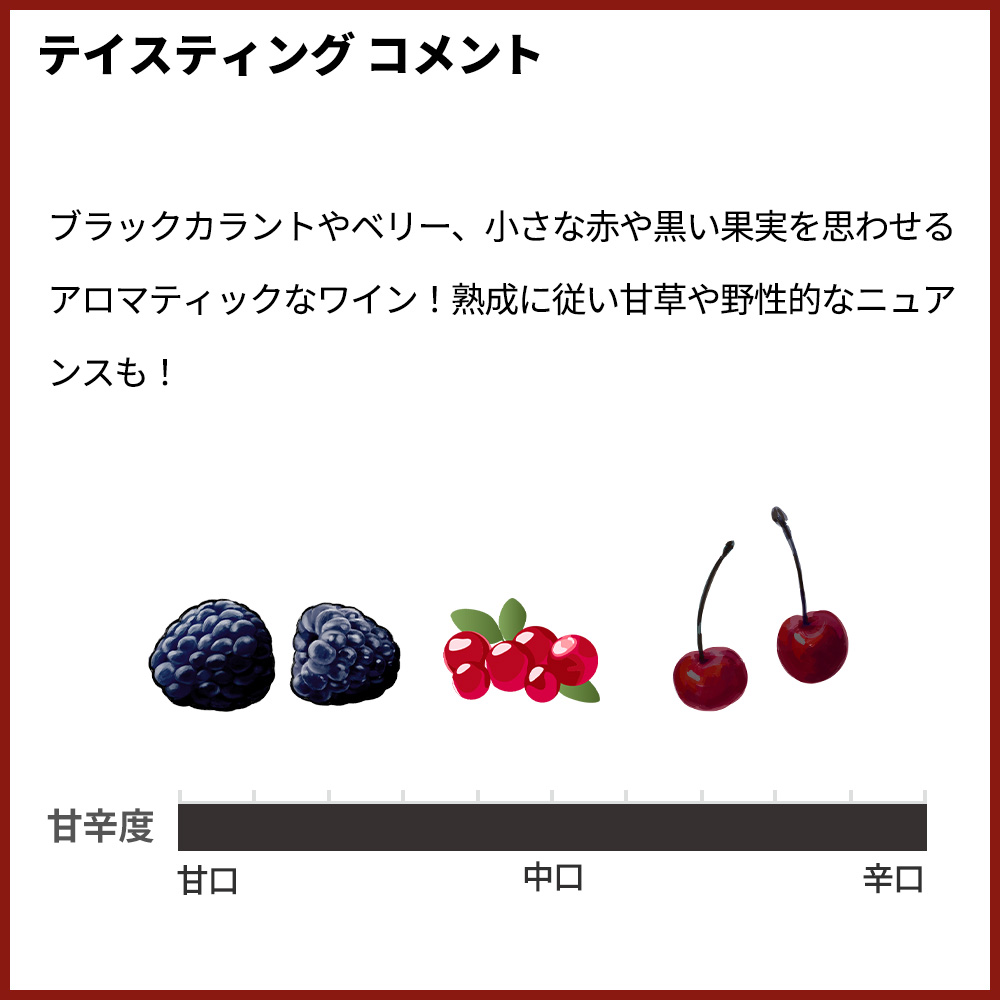 ブラックカラントやベリー、小さな赤や黒い果実を思わせるアロマティックなワイン!熟成に従い甘草や野性的なニュアンスも!