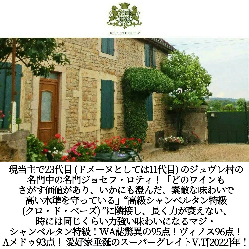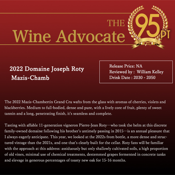 なんとこの2022年のマジ・シャンベルタンでワインアドヴォケイト誌驚異の95点でコメントは「2022年のマジ・シャンベルタン・グラン・クリュは、チェリー、スミレ、ブラックベリーのアロマがグラスから漂う。ミディアムからフルボディ、濃密でピュア、生き生きとした果実味の核を持ち、たっぷりとした甘いタンニンと長く突き抜けたフィニッシュは、継ぎ目がなく完璧。愛想の良い11代目のヴィニュロン、ピエール=ジャン・ロティとのテイスティングは、2015年に兄が早すぎる死を遂げた後、この家族経営のドメーヌの指揮を執るようになったロティにとって、年に一度の楽しみであり、私はいつも心待ちにしている。今年は、2021年よりも濃密で骨格のしっかりしたヴィンテージであり、明らかにセラー用に造られた2022年をボトルから見てみた。ロティのファンなら、このアドレスのアプローチに馴染みがあるだろう。丹念に、しかし浅く耕作された土壌、樹齢の高いブドウの木の比率の高さ、化学的処理の最小化、除梗したブドウをコンクリートタンクで発酵させ、トーストした新樽の割合に余裕を持たせて15~16ヶ月間エラージュする。」と高評価!