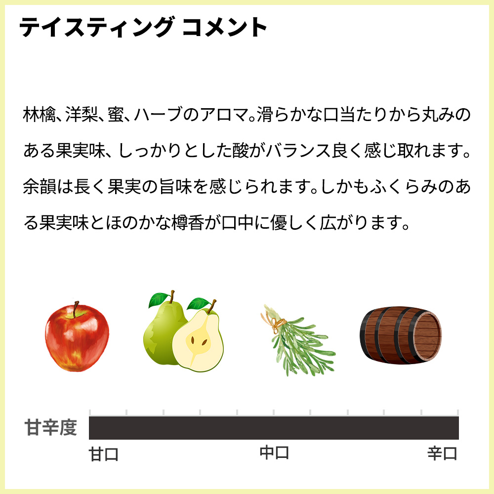 緑がかった透き通る綺麗な麦わら色。林檎、洋梨、蜜、ハーブのアロマ。滑らかな口当たりから丸みのある果実味、しっかりとした酸がバランス良く感じ取れます。余韻は長く果実の旨味を感じられます。しかもふくらみのある果実味とほのかな樽香が口中に優しく広がります。