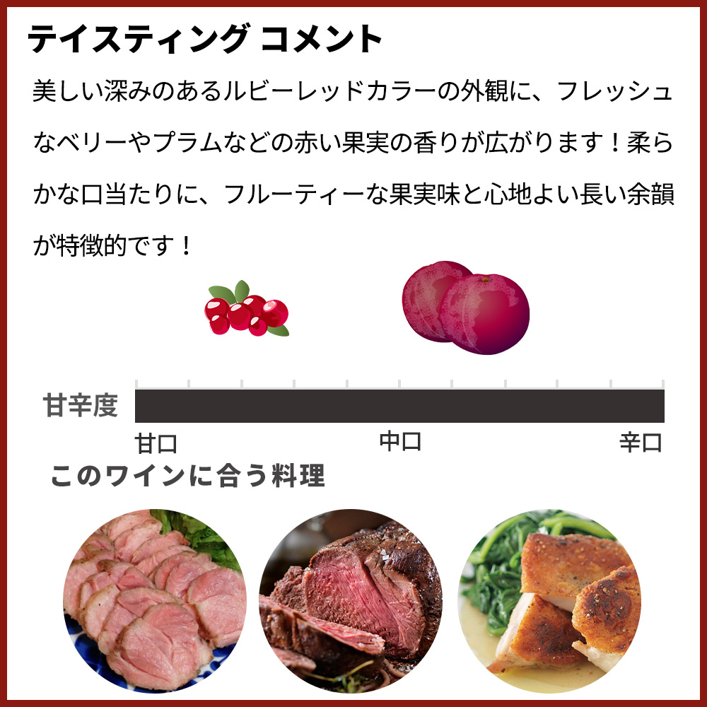 美しい深みのあるルビーレッドカラーの外観に、フレッシュなベリーやプラムなどの赤い果実の香りが広がります!柔らかな口当たりに、フルーティーな果実味と心地よい長い余韻が特徴的です!