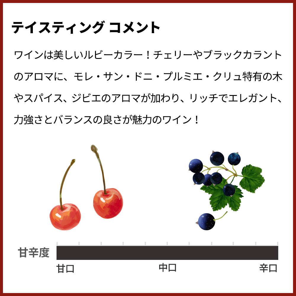 ワインは美しいルビーカラー!チェリーやブラックカラントのアロマに、モレ・サン・ドニ・プルミエ・クリュ特有の木やスパイス、ジビエのアロマが加わり、リッチでエレガント、力強さとバランスの良さが魅力のワイン!もちろん正規品の蔵出し作品で限定で少量入荷!