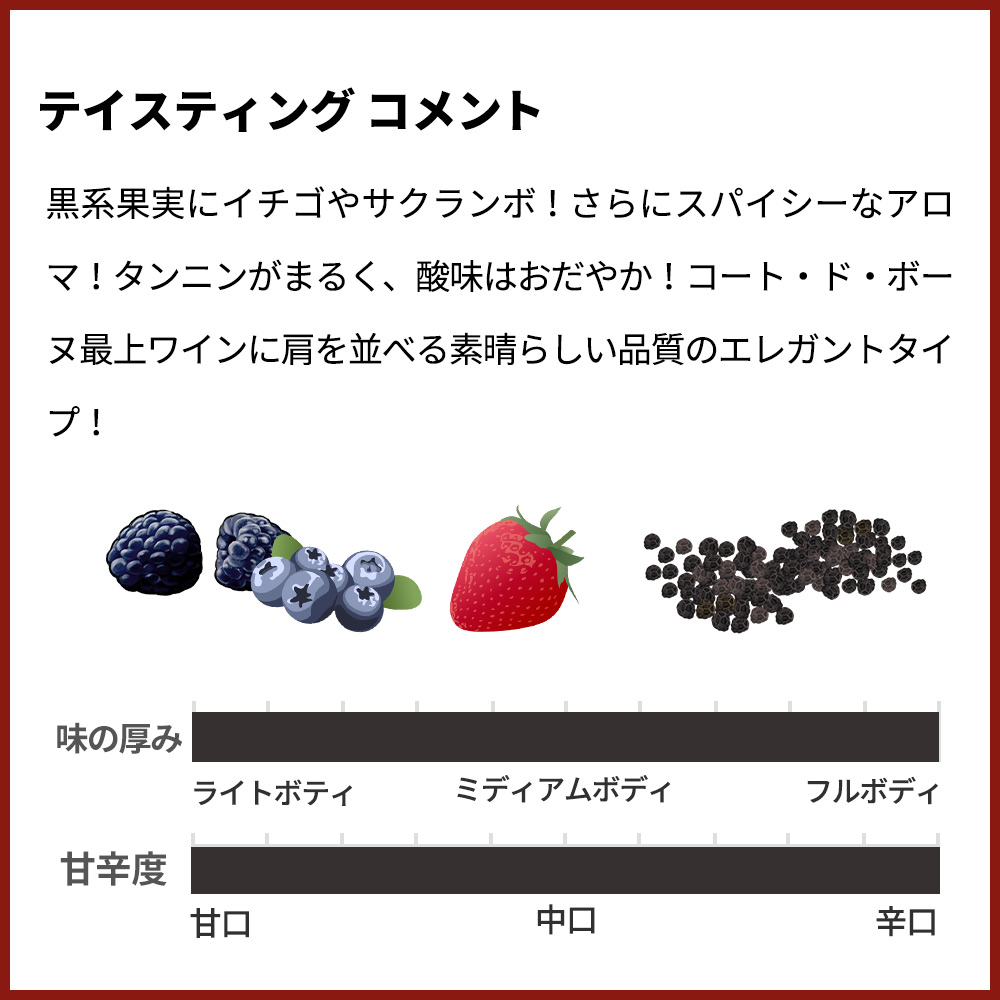 造り手は、あのロバート・パーカー氏に「グラモンはブルゴーニュの中で最も信頼に値する造り手の一人と言える」と激賞させ、M.W.のブルゴーニュの大御所セレナ・サトクリフ女史も「いずれもアペラシオンにふさわしい個性を備えていて好ましい。」と高評価!