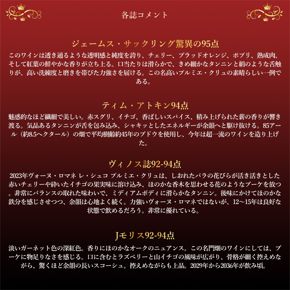 この2023年にジェームス・サックリング驚異の95点でコメントは『このワインは透き通るような透明感と純度を誇り、チェリー、ブラッドオレンジ、ポプリ、熟成肉、そして紅葉の鮮やかな香りが立ち上る。口当たりは滑らかで、きめ細かなタンニンと絹のような舌触りが、高い洗練度と磨きを帯びた力強さを届ける。この名高いプルミエ・クリュの素晴らしい一例である。』!