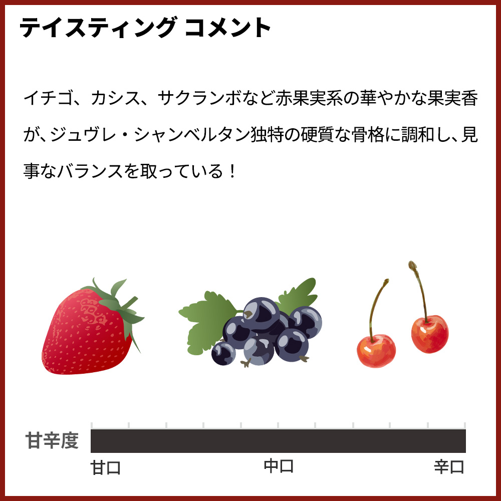 イチゴ、カシス、サクランボなど赤果実系の華やかな果実香が、ジュヴレ・シャンベルタン独特の硬質な骨格に調和し、見事なバランスを取っている!その特徴を引き出しているのがミランダージュと呼ばれるヴィエイユ・ヴィーニュ特有の糖度、ミネラルの高い小粒の葡萄!