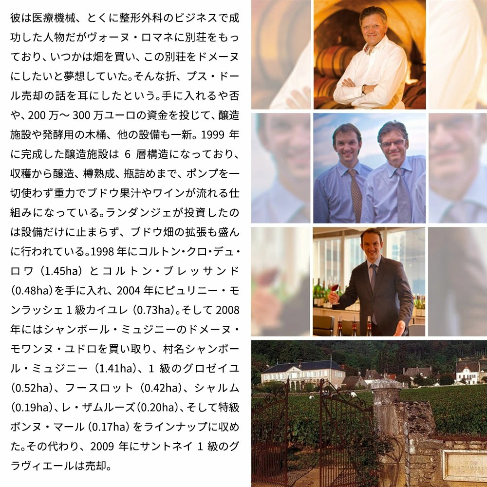 『香りはブレッサンデに似ているが、より明確な野生的な要素が感じられる。中程度の重量感で、若々しい厳しさの中にやや高いミネラル感を持ち、洗練されているが、密度はやや劣る。余韻は意外なほど長く、よくバランスが取れている。深みにはやや欠けるが、時間をかければ容易に発展するだろう。』バーガウンド・ドット・コム