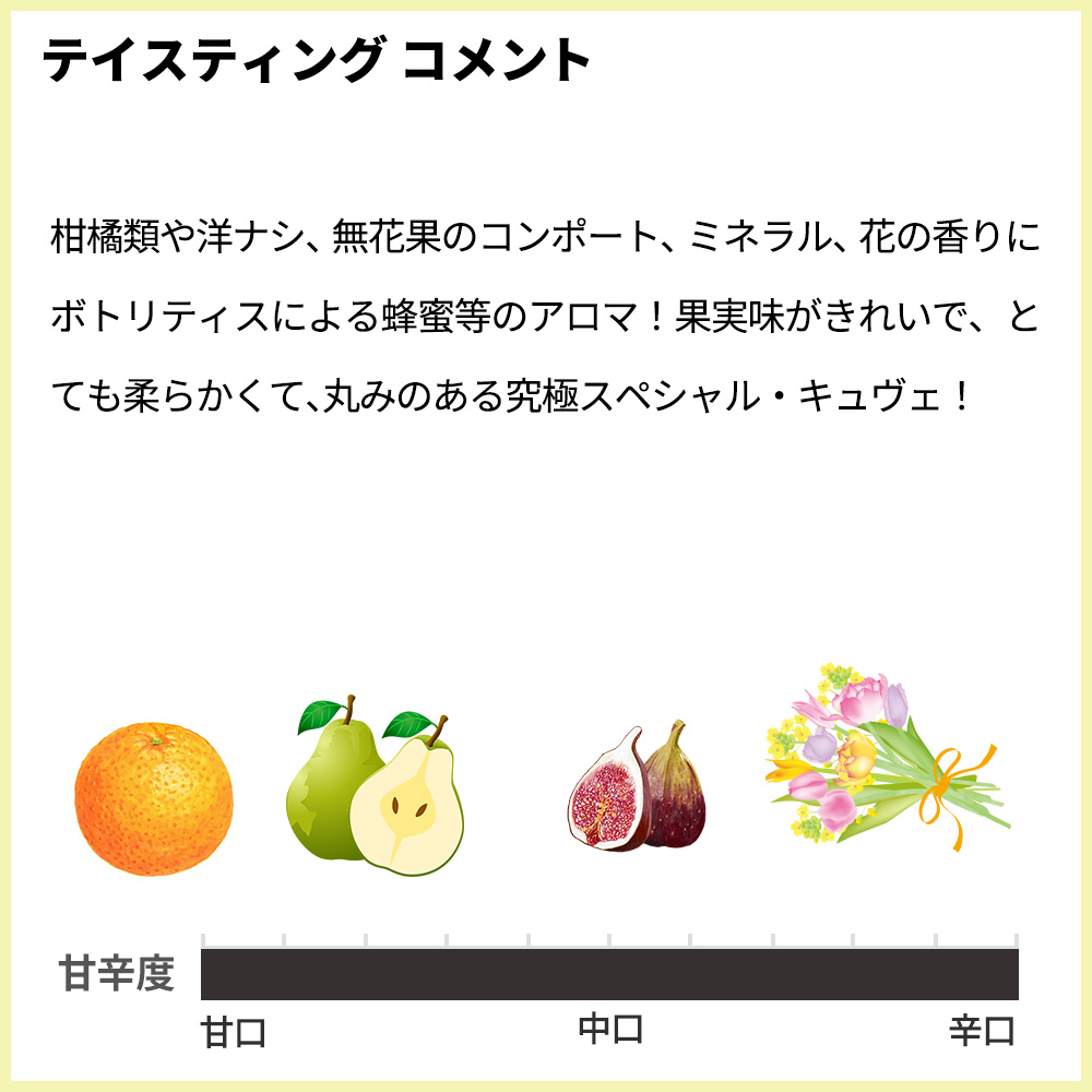 このチュリセは、柑橘類や洋ナシ、無花果のコンポート、ミネラル、花の香りにボトリティスによる蜂蜜等のアロマ!果実味がきれいで、とても柔らかくて、丸みのある究極スペシャル・キュヴェ!トップドメーヌのムルソー 一級畑を想わせる素晴らしい造りのモンスター・キュヴェ!