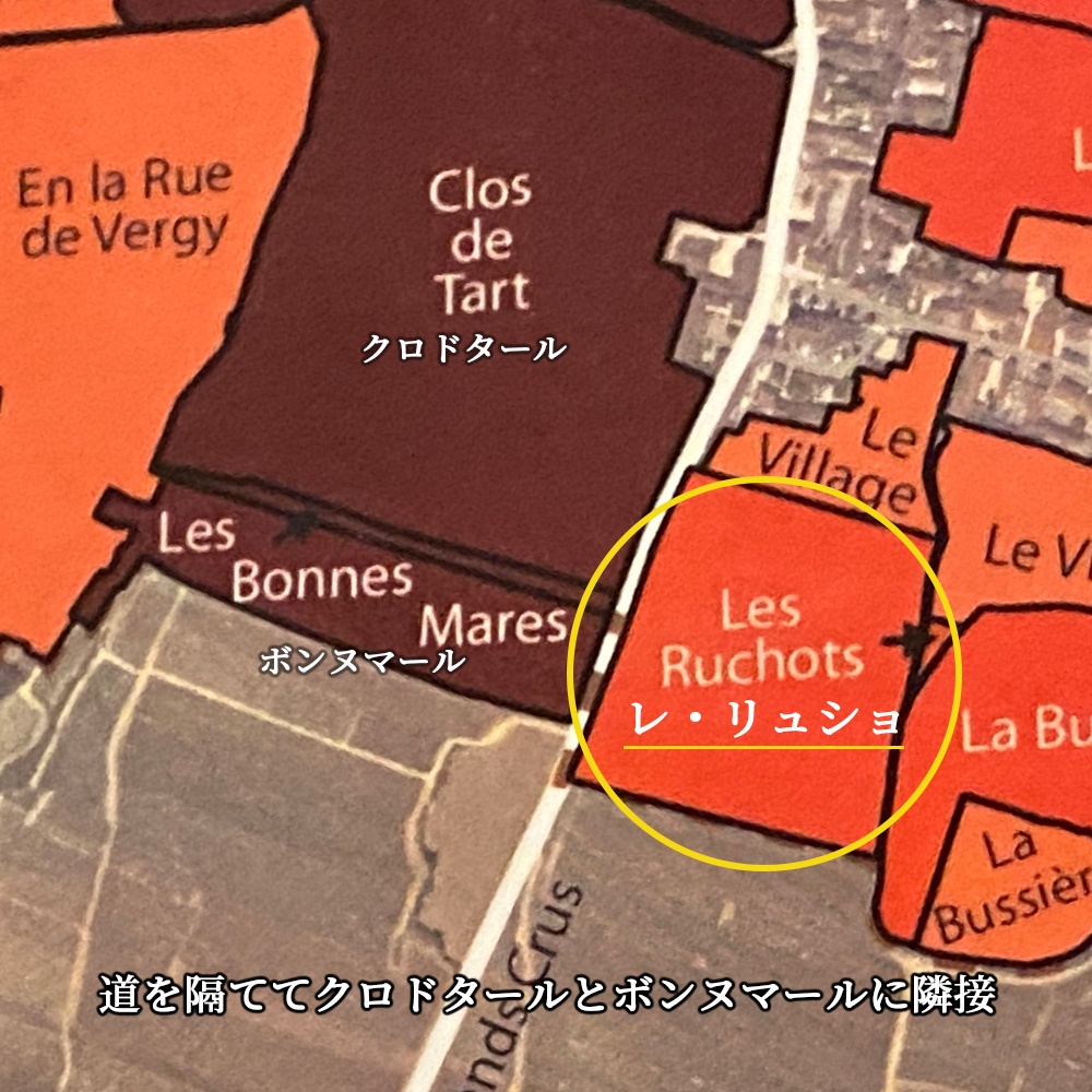 「ボンヌ・マール」の真下、シャンボール・ミュジニー村との境界に位置するモレ最高のプルミエ・クリュ (南隣は人気のシャンボール一級“レ・サンティエ”) として、果実のピュアな味わいが綺麗に表現され、品が良く、エレガントで美しいワインを生み出す“レ・リュショ”!