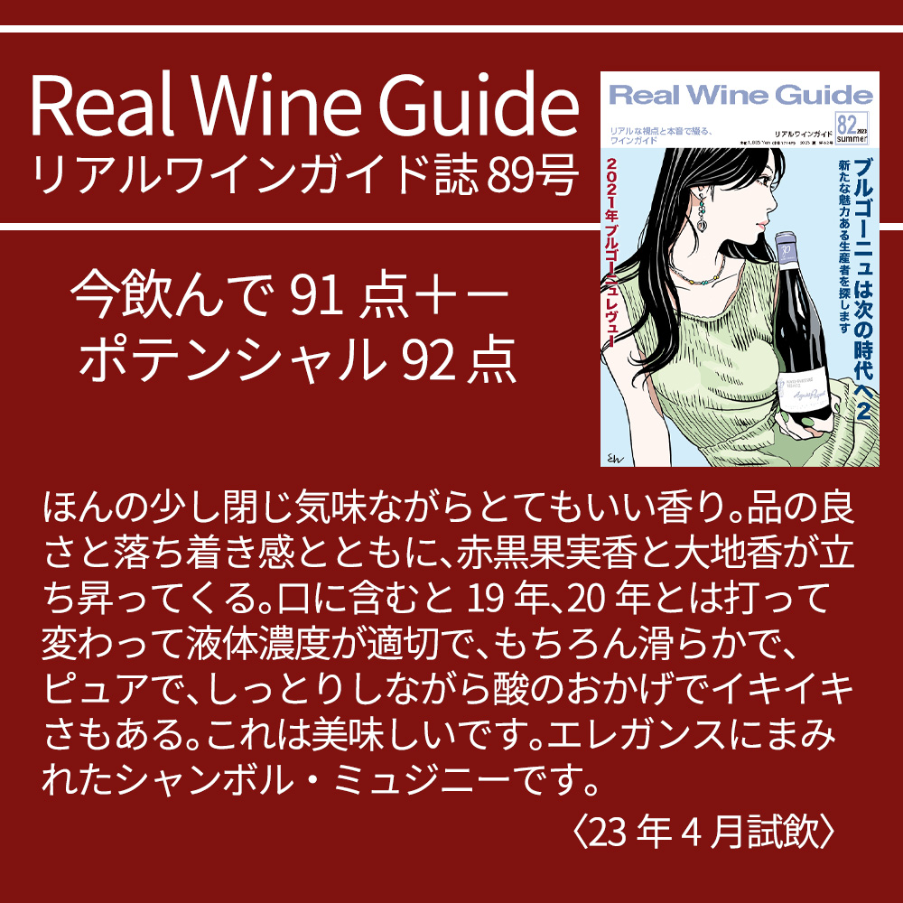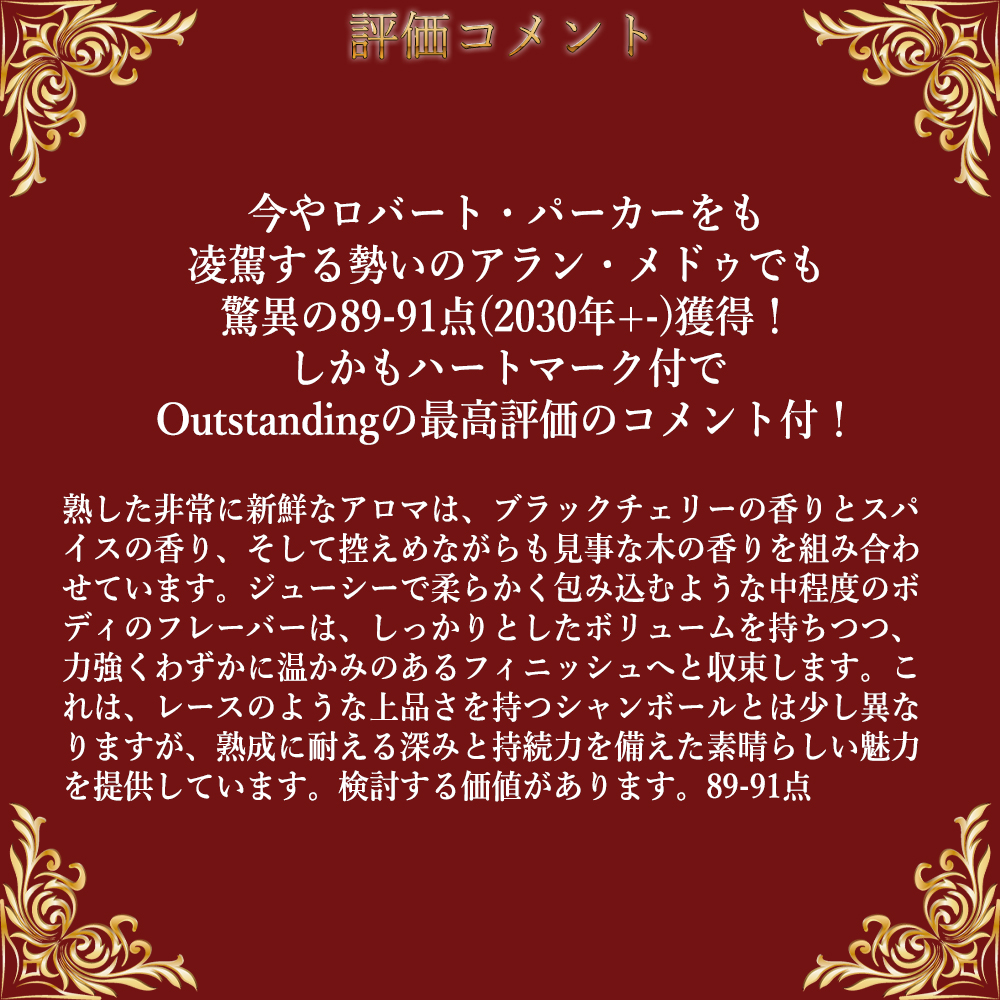 口当たりは、レースのように繊細で、コート・ド・ニュイで最も女性的な味わい!タンニンはキメ細かく、アロマは火を通したフランボワーズやイチゴなどの赤い果実!熟成とともにスミレやプルーンなどの柔らかいブーケが出ると言われる、シャンボール・ミュジニー!