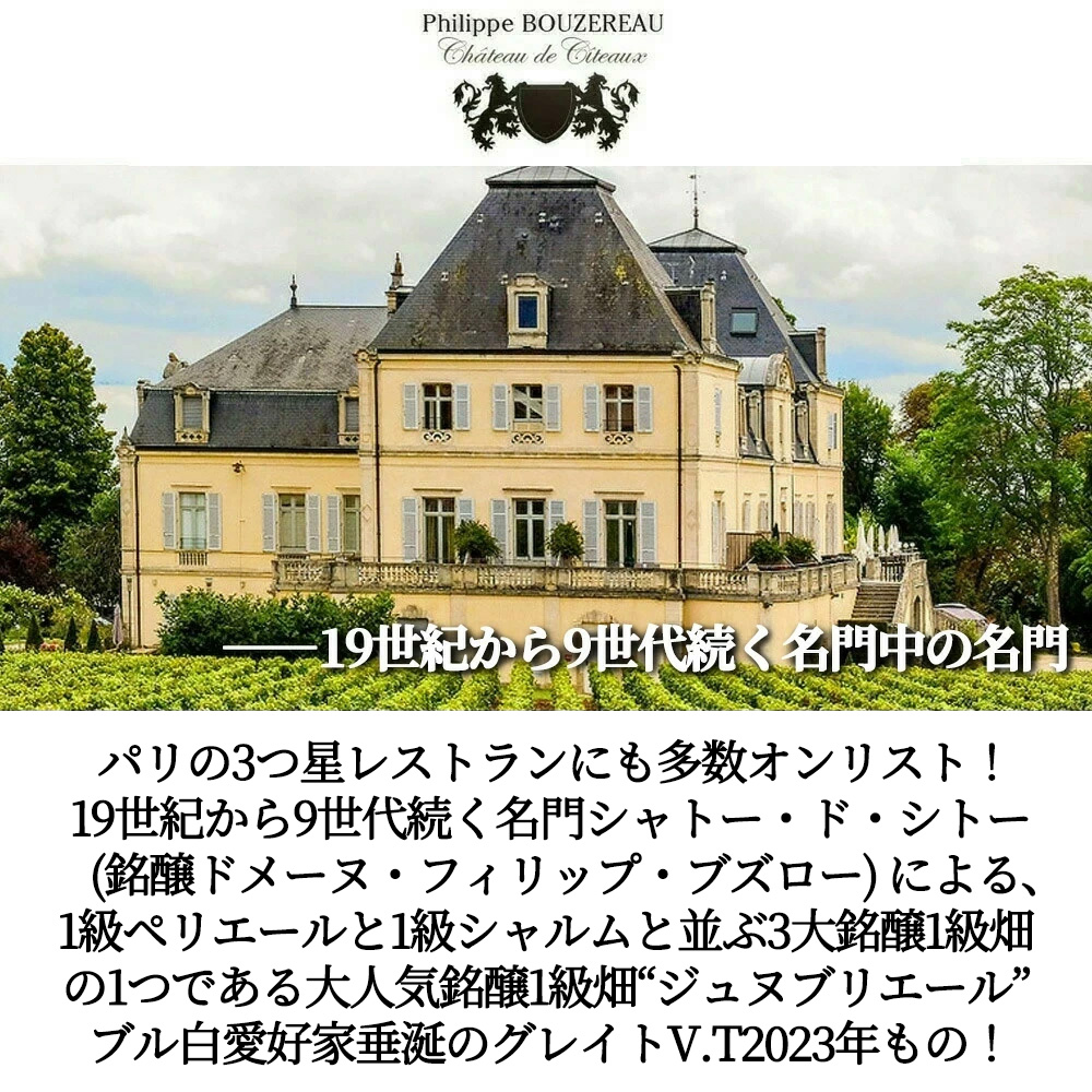 しかも造り手は、19世紀から9世代続く名門中の名門で、パリの3つ星ピエール・ガニェールや、アルザスの2つ星の名門ル・クロコディール、ポール・ボキューズのブラッスリーなどでもオンリスト!アシェット・ガイド誌でも毎年登場で大注目!シャトー・ド・シトー (ドメーヌ・フィリップ・ブーズロー) の元詰もの!