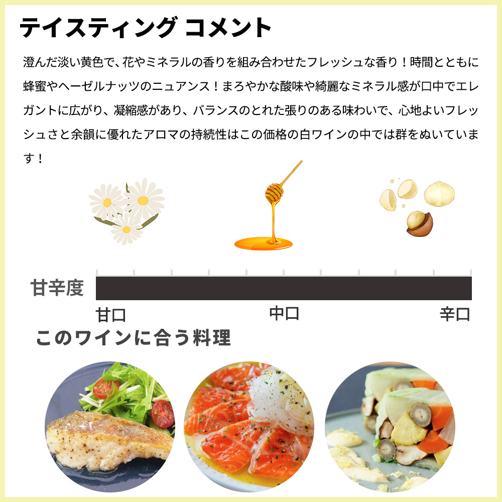 透明感のある黄金色!豊かで繊細な香り!洗練され発達したアロマは、白い花や柑橘系、さらにはヘーゼルナッツや蜂蜜を連想させる、究極の味わい!