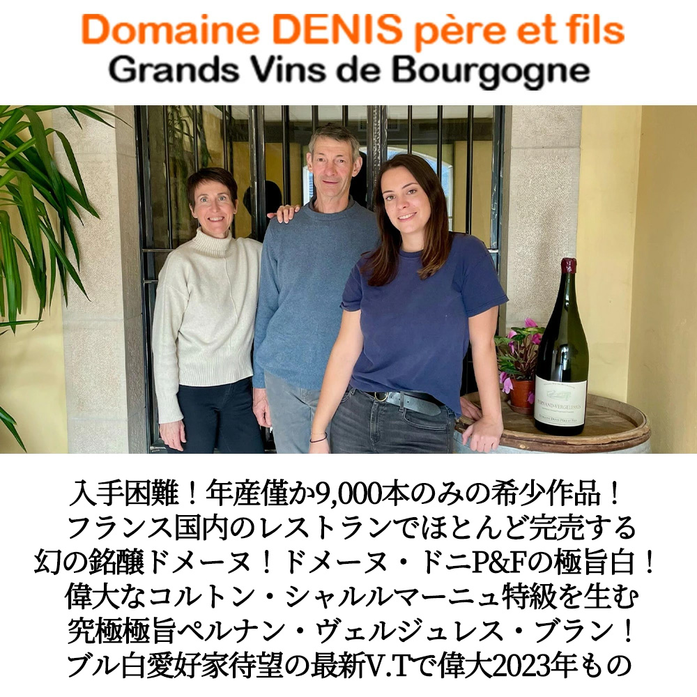 造り手は、1972年に自社瓶詰めを開始!生産されるワインの多くはフランス国内のレストランに販売されており、日本ではなかなかお目にかかれない、フランス国内のレストランでほとんど完売してしまう幻のドメーヌ!現当主、クリストフ・ドニ氏ができる限り自然に近い農法と醸造法でワインを生み出すドメーヌ・ドニ・ペール・エ・フィスからの極旨ペルナン・ヴェルジュレス・ブラン!泥灰質、石灰質土壌の厳格な自然派リュット・レゾネの平均樹齢25年の超厳選シャルドネ100%をフレンチオーク樽熟成11ヶ月 (新樽比率10%) で造られる高級ブルゴーニュ白ワイン!