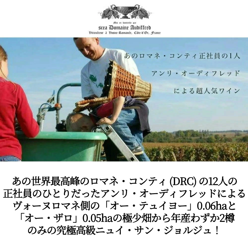 過去、リアルワインガイド誌18号では「極めて正しいメンタリティを持った誠実な生産者が造る優しさと奥深さに満ちたハイクオリティなワイン」として特集記事!同誌22号では「各キュヴェとも生産本数は極めて少ない。人気アイテムの入手は容易ではないと思う。ゲットできる幸運を祈るしかないと思う」と大注目させたオーディフレッドによる「オー・テュイヨー」0.06haと「オー・ザロ」0.05haの極少畑 ([ニュイ・サン・ジョルジュ]の中でもヴォーヌ・ロマネ村と隣接する隣村にあり、さらには、ロマネコンティ、ラターシュ、リシュブールと同じ等高線上にある、[オー・ザロ AuxAllot]、[ニュイ・サン・ジョルジュ]の中でも[オー・テュイヨー Aux Tuyaux]と名の付く一級畑の隣の極上畑に植わる、樹齢驚異の50年もののVVヴィエイユ・ヴィーニュのピノ・ノワール100%をオーク樽16ヶ月熟成で造られる究極ニュイ・サン・ジョルジュAOC!