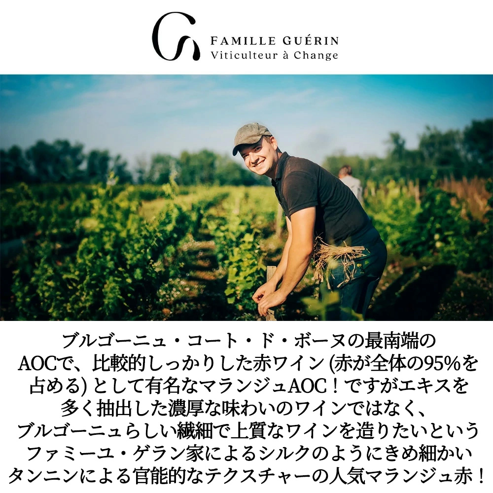 このマランジュ シュル・ル・ボワ ルージュ[2023]年・ファミーユ・ゲラン元詰は2.23haの畑からの平均樹齢驚異の70年のスーパーVVのピノノワールを収量は45hl/ha。ステンレスタンクでアルコール発酵後、樽でマロラクティック発酵&12ヶ月間熟成。新樽比率は20%。で造られます。