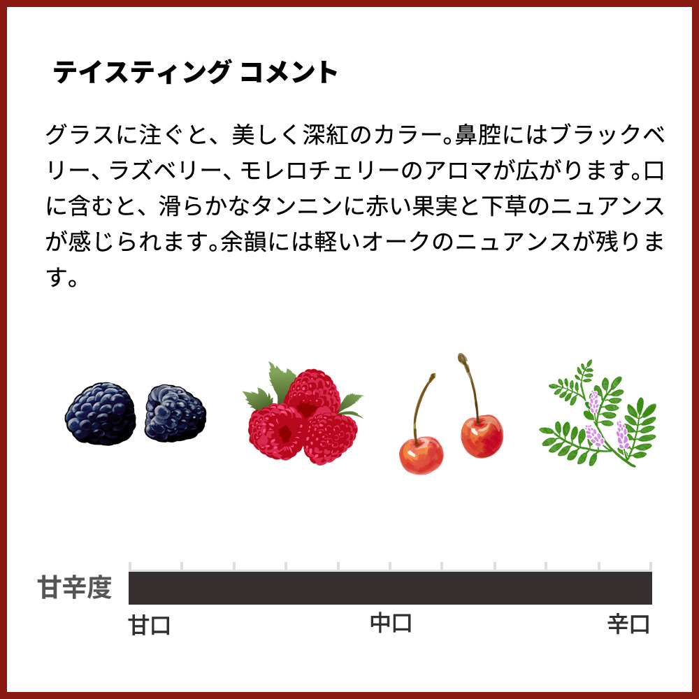 ドメーヌからのテイスティングコメントは『グラスに注ぐと、美しく深紅のカラー。鼻腔にはブラックベリー、ラズベリー、モレロチェリーのアロマが広がります。口に含むと、滑らかなタンニンに赤い果実と下草のニュアンスが感じられます。余韻には軽いオークのニュアンスが残ります。』とコメント!