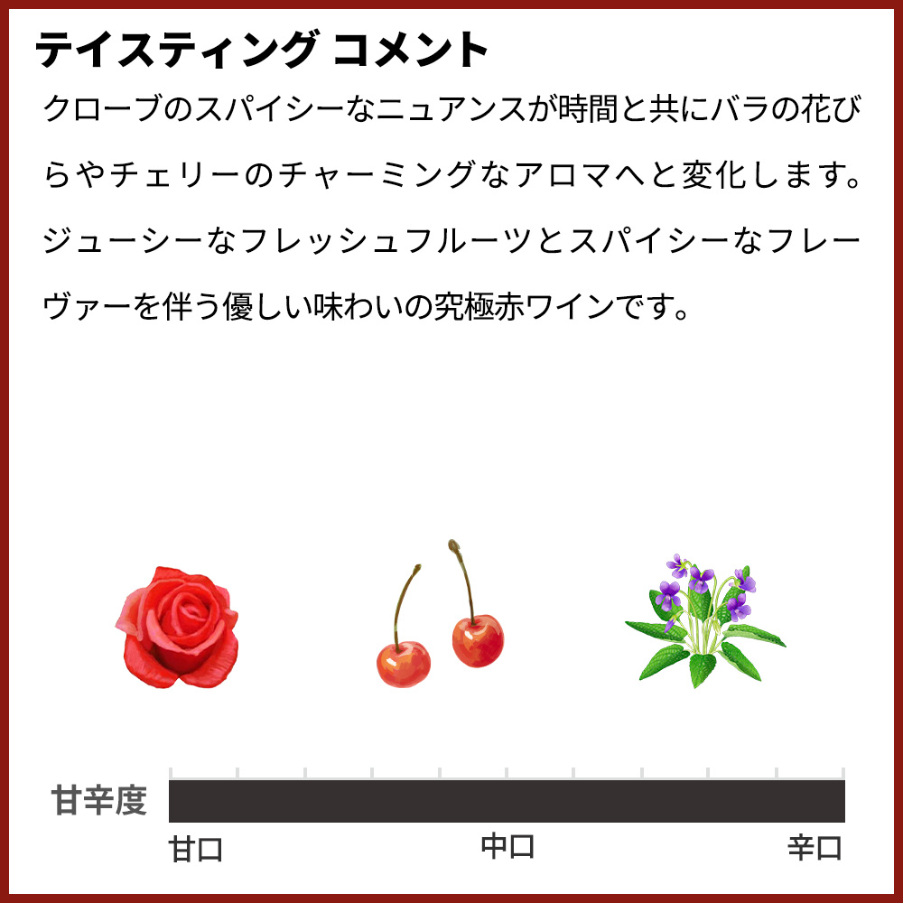 クローブのスパイシーなニュアンスが時間と共にバラの花びらやチェリーのチャーミングなアロマへと変化します。ジューシーなフレッシュフルーツとスパイシーなフレーヴァーを伴う優しい味わいの究極赤ワインです。