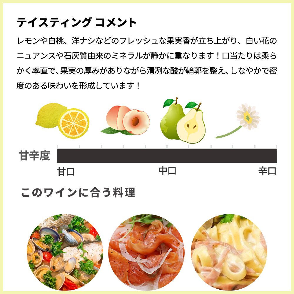 グラスに注ぐと、淡い黄金色の輝きとともに、レモンや白桃、洋ナシなどのフレッシュな果実香が立ち上がり、白い花のニュアンスや石灰質由来のミネラルが静かに重なります!口当たりは柔らかく率直で、果実の厚みがありながら清冽な酸が輪郭を整え、しなやかで密度のある味わいを形成しています!ステンレスと500L樽の発酵・熟成によって、清潔感と豊かな旨味がほどよく共存し、後半にはほのかなヨードやミネラルの余韻が長く続きます!全体としてバランスが非常に良く、自然な醸造が生み出すピュアさと深みが共存する一本!魚介料理からクリーム系まで幅広い料理と調和し、今飲んでも楽しめ、さらに数年の熟成で複雑味が増すことが期待できる逸品!